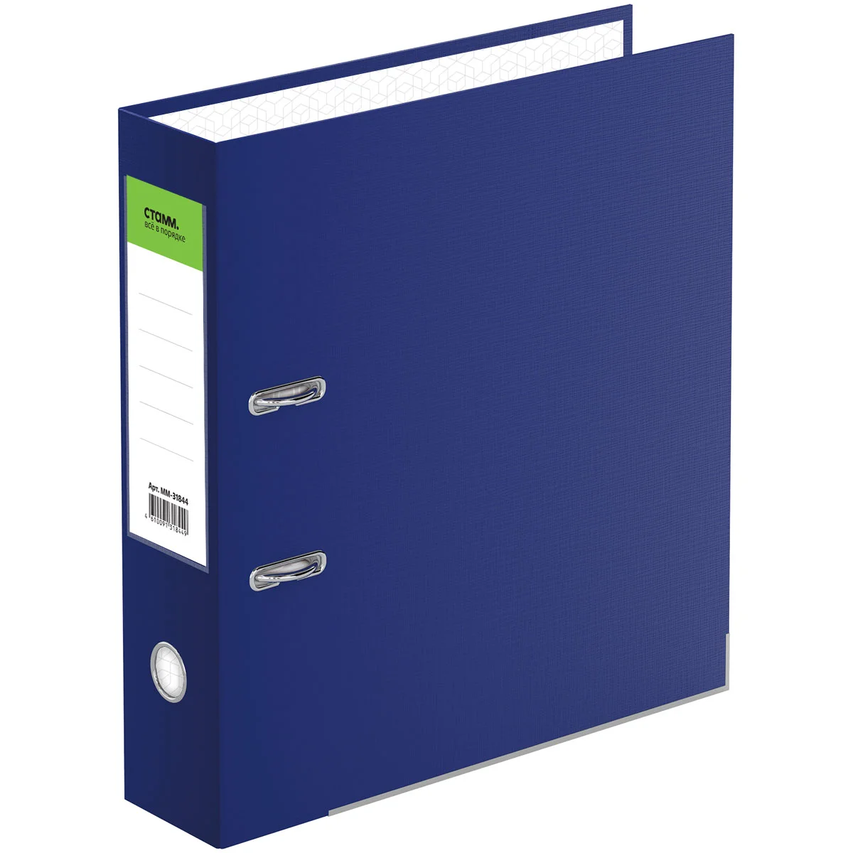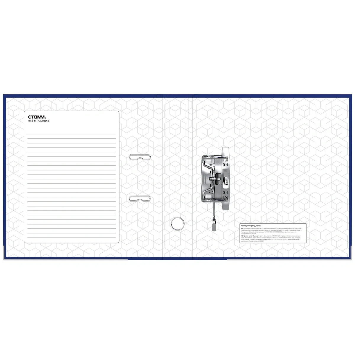 Папка-регистратор «СТАММ» серии «Бизнес» формата А4 с арочным механизмом эффективно экономит офисное пространство и идеальна для создания архива. Папка вмещает до 550 листов. Размер папки – 320*290*70 мм. Ориентация – вертикальная. Ширина корешка составляет 70 мм. Минималистичный классический дизайн: папка выполнена в глубоком синем цвете. Изготовлена из жесткого износостойкого картона с односторонним покрытием из бумвинила. Нижние грани укреплены металлическим кантом. Внутреннее покрытие – бумага. Папка имеет арочный механизм из качественного металла. Конструкция разработана с учетом всех особенностей эксплуатации. Эргономичное отверстие в корешке помогает быстро снять папку с полки. На корешке папки есть карман со сменным информационным ярлыком для маркировки. На внутренней стороне обложки папка-регистратор имеет поле для записи.