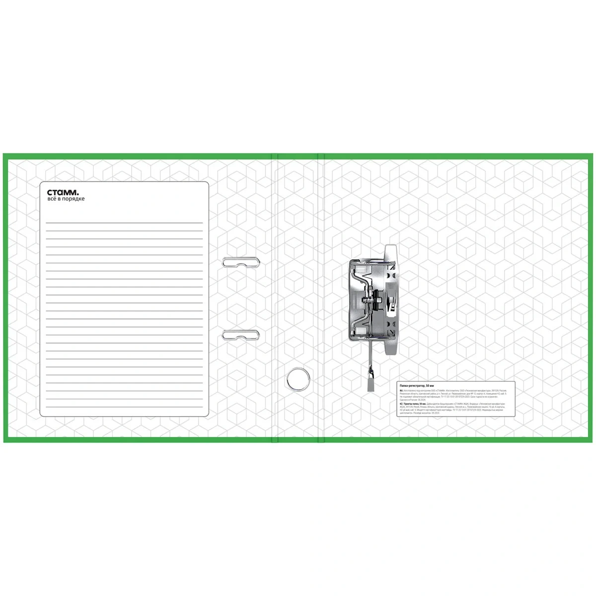Папка–регистратор «СТАММ» серии «Стандарт» размером А4 (320*290*50 мм) с обложкой из жесткого износостойкого картона с односторонним покрытием из бумвинила. Вместимость папки – 450 листов, ширина корешка – 50 мм. Цвет – салатовый. Конструкция разработана с учетом всех особенностей эксплуатации. Папка выгодно отличается надежным арочным механизмом из качественного металла, наличием кармана на корешке со сменным информационным ярлыком для маркировки, полем для записей на внутренней стороне обложки и отверстием для удобного снятия с полки. Папка предназначена для транспортировки, упорядочивания и хранения бумаг.