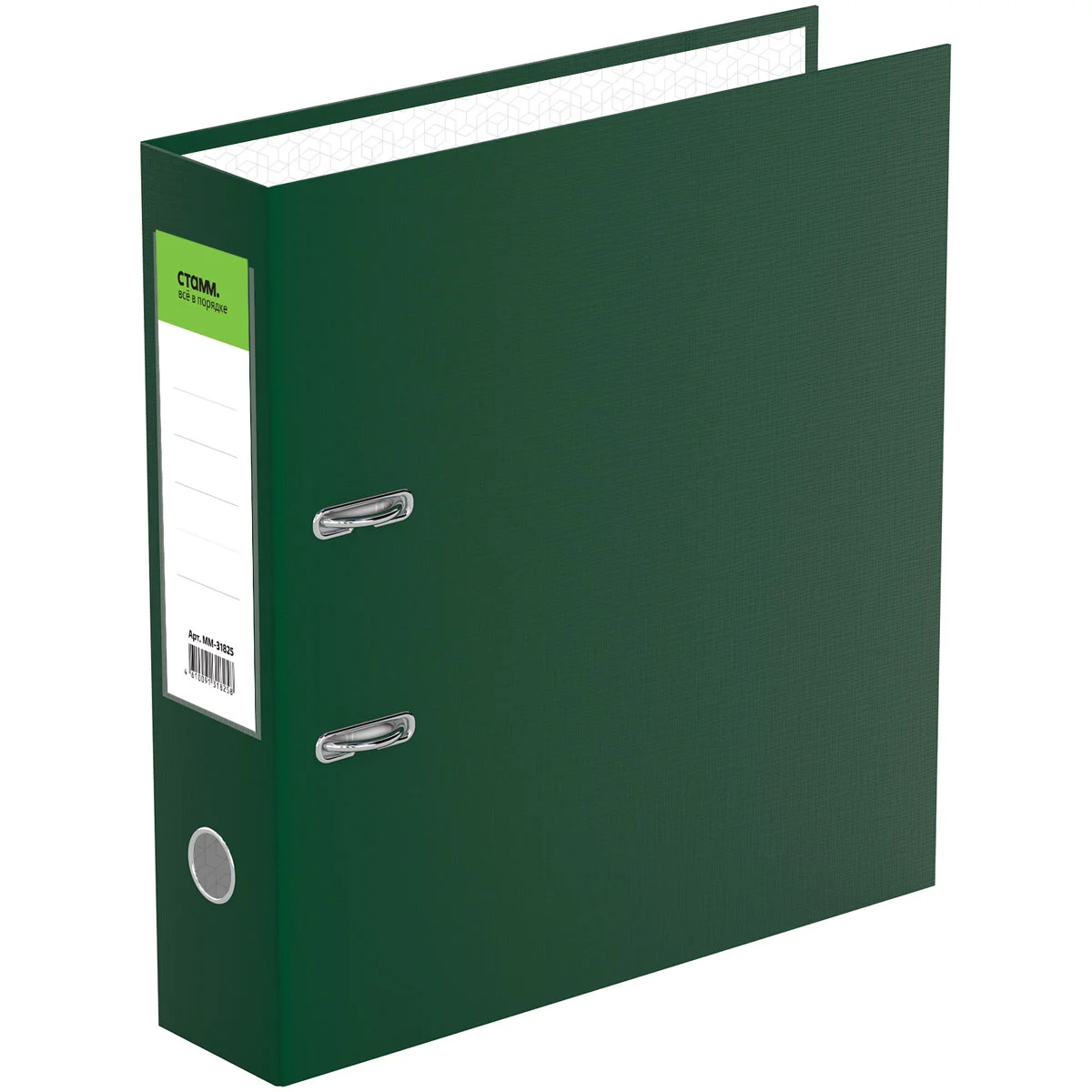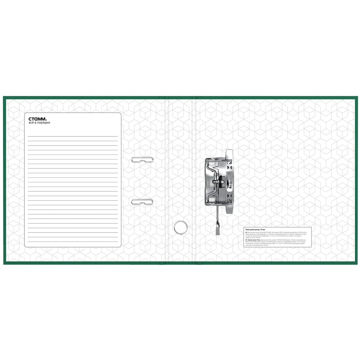 Папка–регистратор Стамм серии 'Стандарт' размером А4 (320*290*70 мм) с обложкой из жесткого износостойкого картона с односторонним покрытием из бумвинила. Вместимость папки – 550 листов, ширина корешка – 70 мм. Цвет – зеленый. Конструкция разработана с учетом всех особенностей эксплуатации. Папка выгодно отличается надежным арочным механизмом из качественного металла, наличием кармана на корешке со сменным информационным ярлыком для маркировки, полем для записей на внутренней стороне обложки и отверстием для удобного снятия с полки. Папка предназначена для транспортировки, упорядочивания и хранения бумаг.