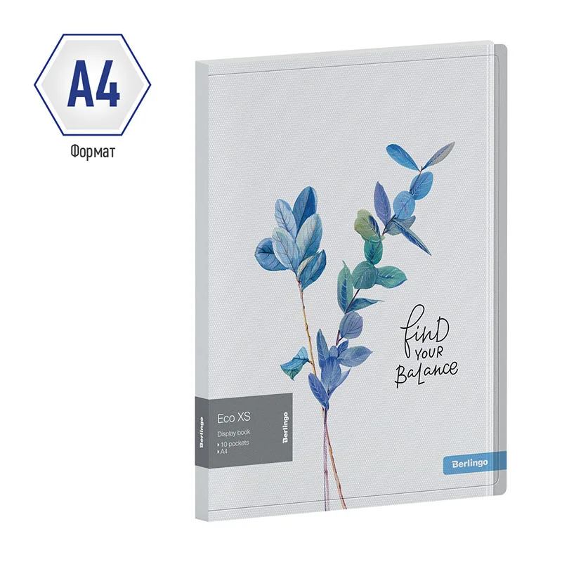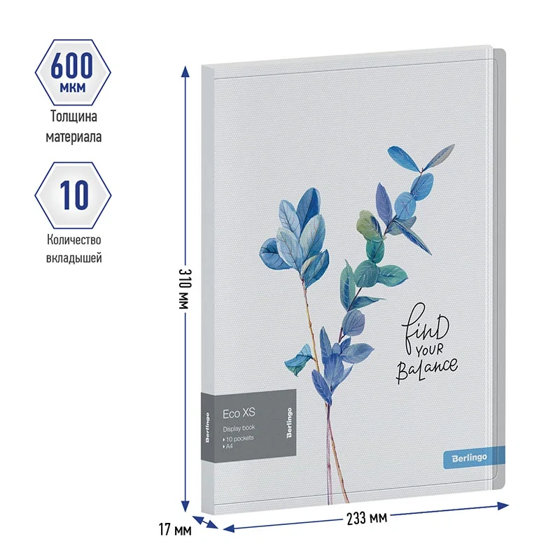 Папка Berlingo Eco XS формата А4 содержит 10 вкладышей, которые надёжно защищают листы от повреждений. Листы-карманы увеличенной толщины 30мкм надежно скреплены сваркой. Размер изделия: 310*233*17 мм, ширина корешка: 17 мм, толщина материала: 600 мкм. Изготовлена из высококачественного полипропилена с матовой текстурой поверхности 'песок', на которой не видно отпечатков пальцев и мелких царапин. На внутренней стороне обложки оснащена плотным прозрачным карманом для удобного хранения мелочей: ручки, заметок, визиток, дисков, флешек и др. Папка вмещает до 100 бумажных листов. Упакована в индивидуальный прозрачный пакет