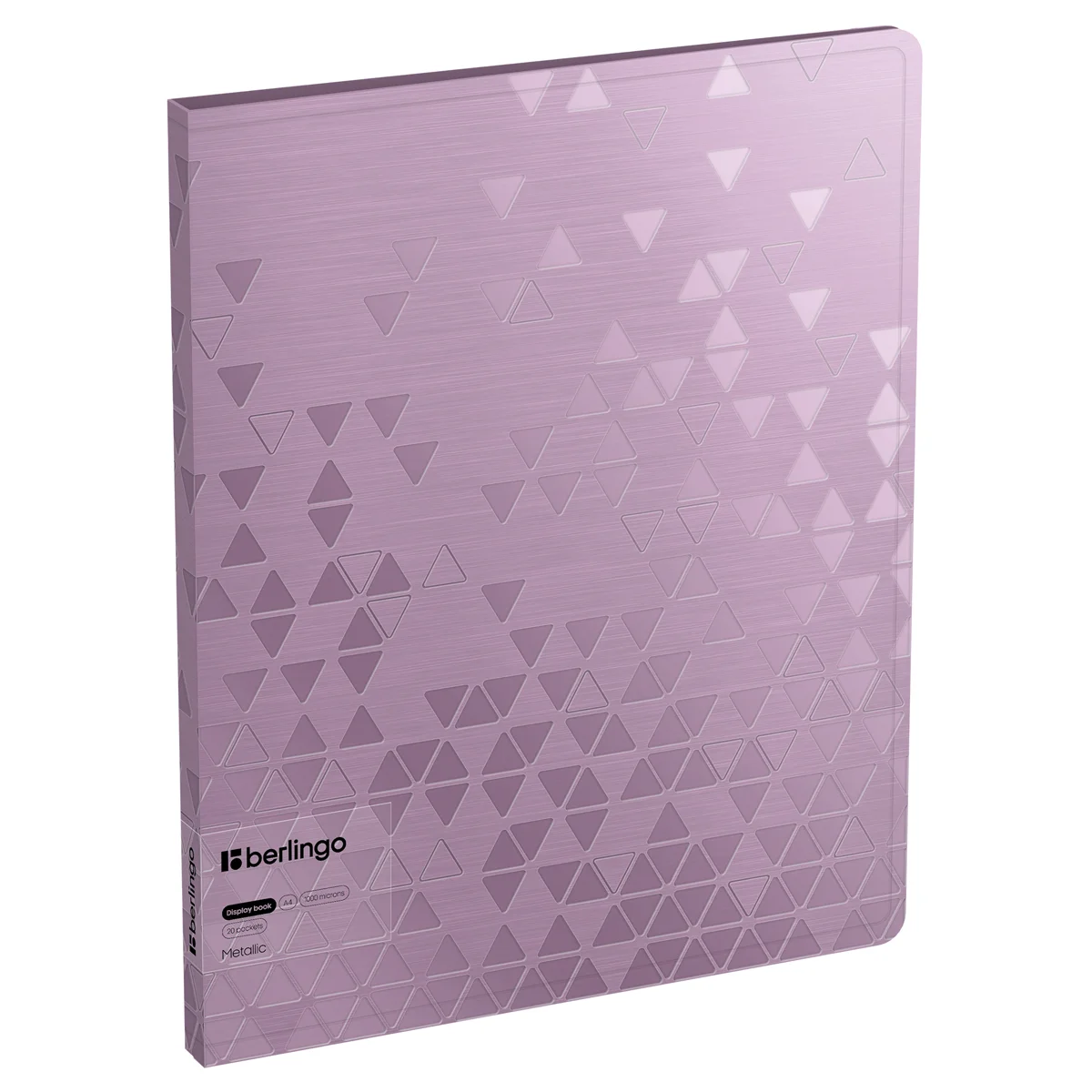 Папка Berlingo Metallic формата А4 содержит 20 вкладышей, которые надёжно защищают листы от повреждений. Листы-карманы увеличенной толщины 30мкм надежно скреплены сваркой. Размер изделия: 310*235*17 мм, ширина корешка: 17 мм, толщина материала: 1000 мкм. Изготовлена из высококачественного полипропилена с матовой текстурой поверхности «рельефные треугольники», на которой не видно отпечатков пальцев и мелких царапин. На внутренней стороне обложки оснащена плотным прозрачным карманом для удобного хранения мелочей: ручки, заметок, визиток, дисков, флешек и др. Папка вмещает до 100 бумажных листов. Упакована в индивидуальный прозрачный пакет.