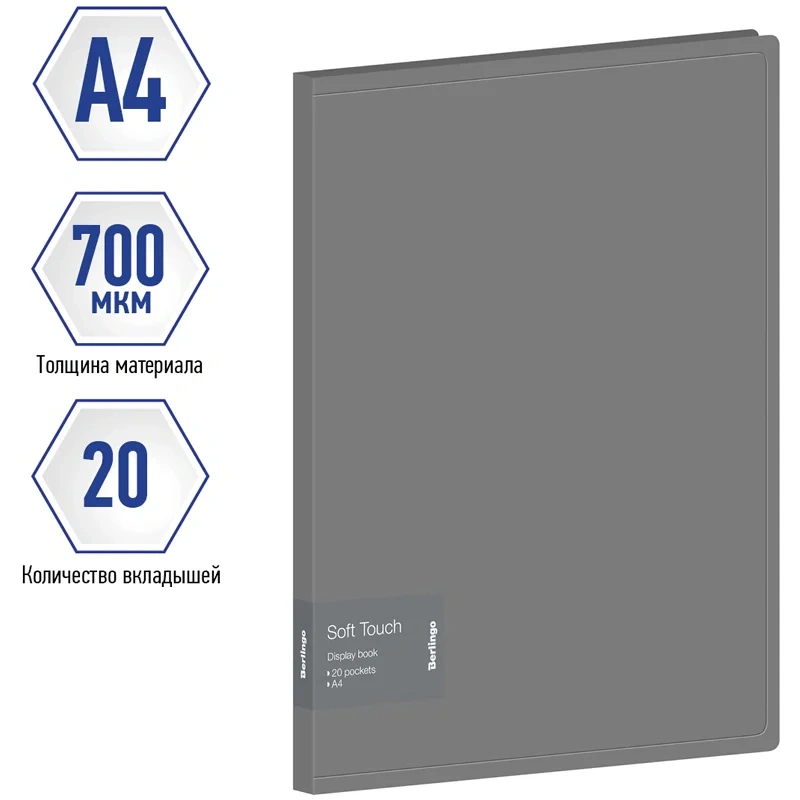 Папка с 20 вкладышами Berlingo 'Soft Touch', 17мм, 700мкм, серая, с внутр. карманом