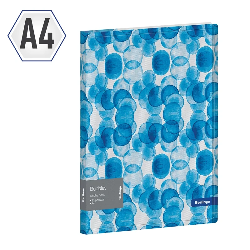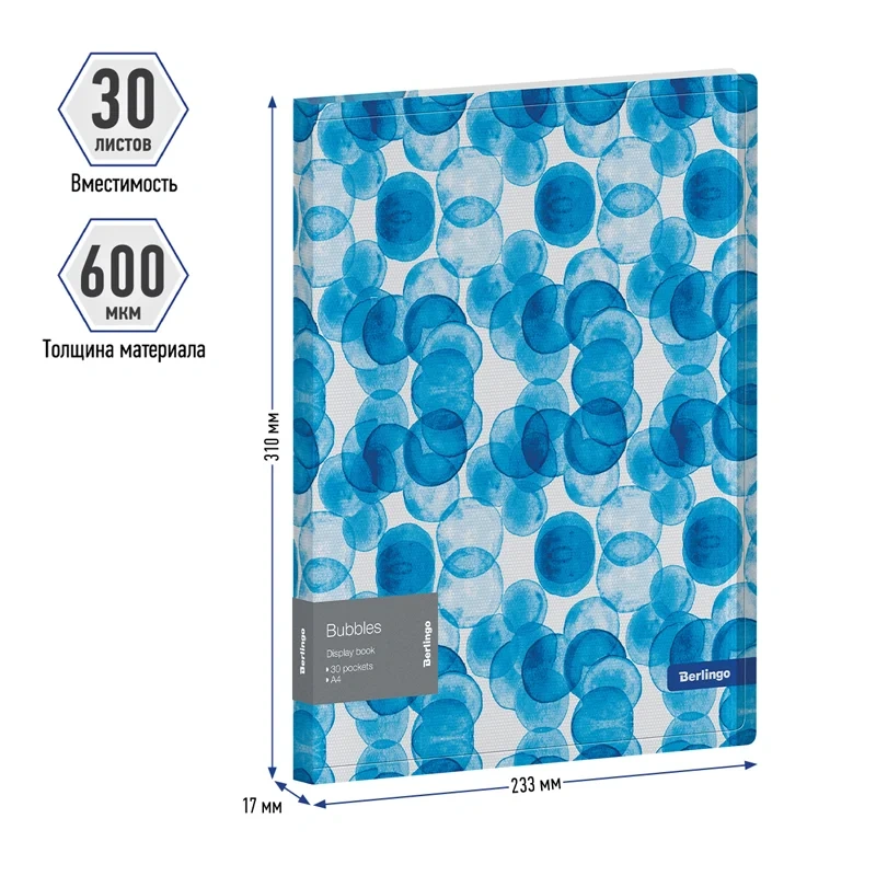 Папка с вкладышами Berlingo серии Bubbles формата А4 с рисунком предназначена для хранения документов. Папка имеет размер 310*233*17 мм. Она изготовлена из полипропилена с матовой текстурой поверхности 'песок', на которой не видно отпечатков пальцев и мелких царапин. Имеет белый цвет во внутренней стороне папки. Ширина корешка 17 мм. Содержит 30 прозрачных листов-карманов увеличенной толщины 30мкм, надежно скрепленных сваркой. На внутренней стороне обложка оснащена плотным прозрачным карманом для удобного хранения мелочей: ручки, заметок, визиток, дисков, флешек и др.