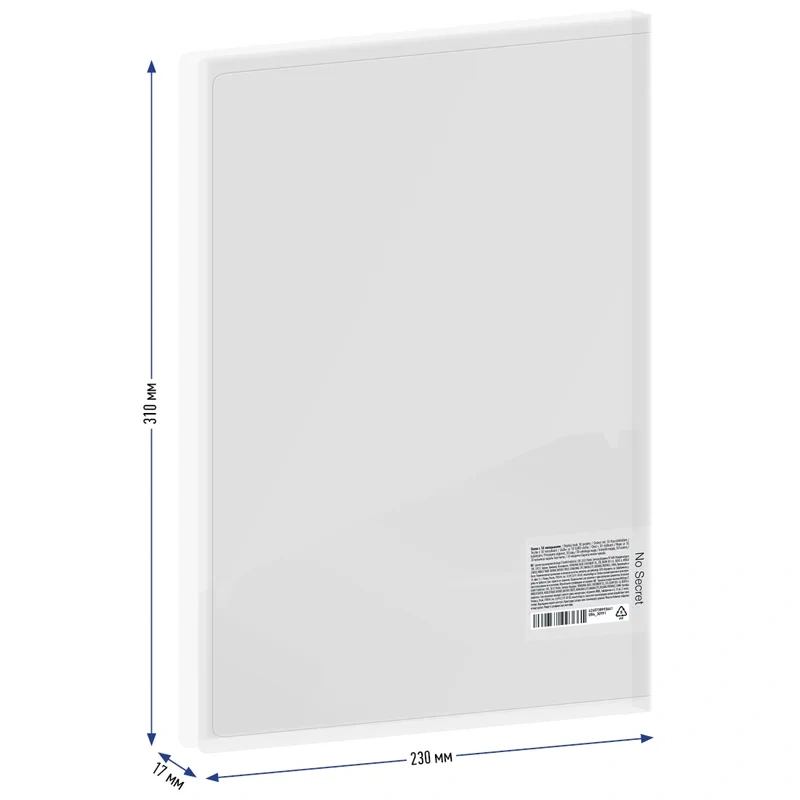 Папка Berlingo серии No Secret с 30 вкладышами формата А4 - отличный и стильный помощник для хранения документов с плотной обложкой с приятной софт-тач фактурой. Особенностью данной серии является прозрачная обложка. Толщина обложки - 700 мкм. Тип скрепления – термосварка. Ширина корешка - 17 мм. Папка изготовлена из высококачественного полипропилена с особой фактурой с эффектом софт-тач. Внутренняя сторона обложки оснащена плотным прозрачным карманом для удобного хранения мелочей: ручки, заметок, визиток, дисков, флешек и др. Папка выполнена в размере 310*233*17 мм. Папка имеет прозрачные фактурные листы-карманы увеличенной толщины 30 мкм, надёжно скреплённые сваркой. Вмещает до 100 бумажных листов. Индивидуальная упаковка в прозрачный пакет по форме. Папка оснащена съемным стикером с выходной информацией и штрих-кодом.