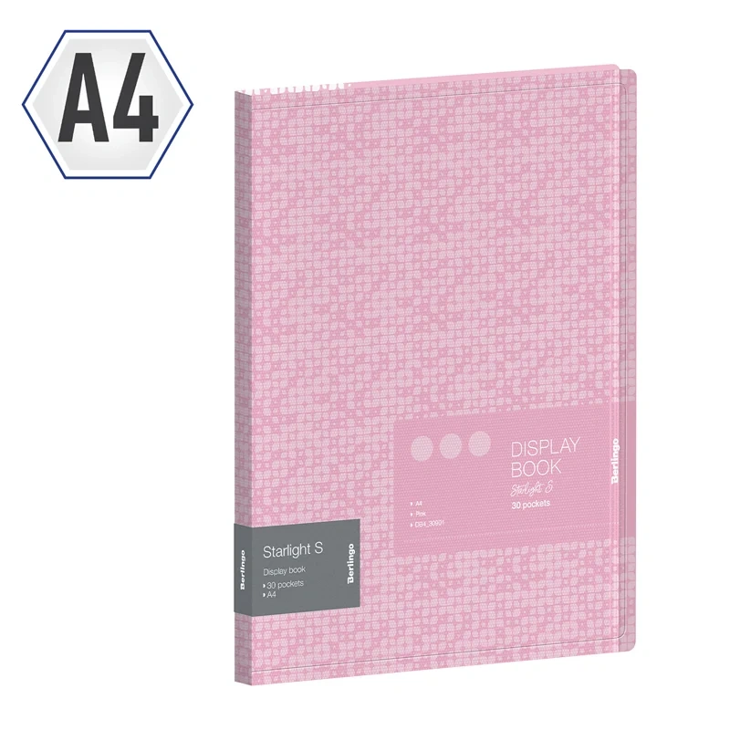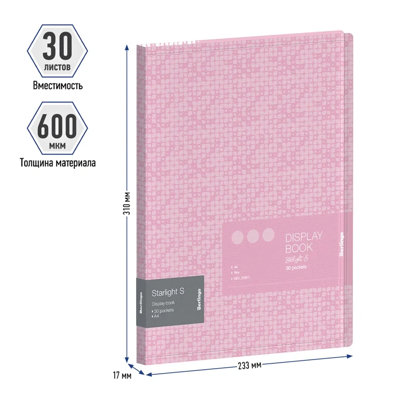 Папка Berlingo серии Starlight S с 30 вкладышами формата А4 - отличный и стильный помощник для хранения документов. Представлена в розовом цвете с рисунком. Толщина полупрозрачной обложки - 600 мкм. Тип скрепления – термосварка. Ширина корешка - 17 мм. Папка изготовлена из высококачественного полипропилена с матовой текстурой поверхности 'песок', на которой не видно отпечатков пальцев и мелких царапин. Внутренняя сторона обложки оснащена плотным прозрачным карманом для удобного хранения мелочей: ручки, заметок, визиток, дисков, флешек и др. Папка выполнена в размере 310*233*17 мм. Папка имеет прозрачные листы-карманы увеличенной толщины 30 мкм, надёжно скреплённые сваркой. Вмещает до 100 бумажных листов. Индивидуальная упаковка в прозрачный пакет.