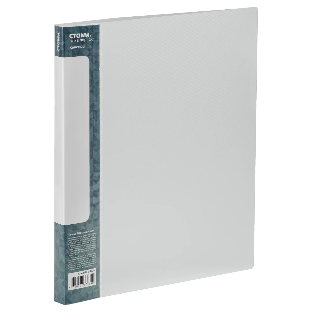 Папка с 30 вкладышами «СТАММ» серии «Кристалл» – отличный помощник для хранения бумаг формата А4. Изделие выполнено из полупрозрачного пластика. Внешняя сторона папки дополнена фактурным паттерном «Кристалл», сохраняющим внешний вид изделия от загрязнений и повреждений. Размер изделия составляет 310*235 мм. Ширина корешка – 17 мм. Тип скрепления – термосварка. Бумагам, вложенным в папку, не требуется перфорация дыроколом. На корешке папки есть удобный карман. Папка упакована в индивидуальный пакет.