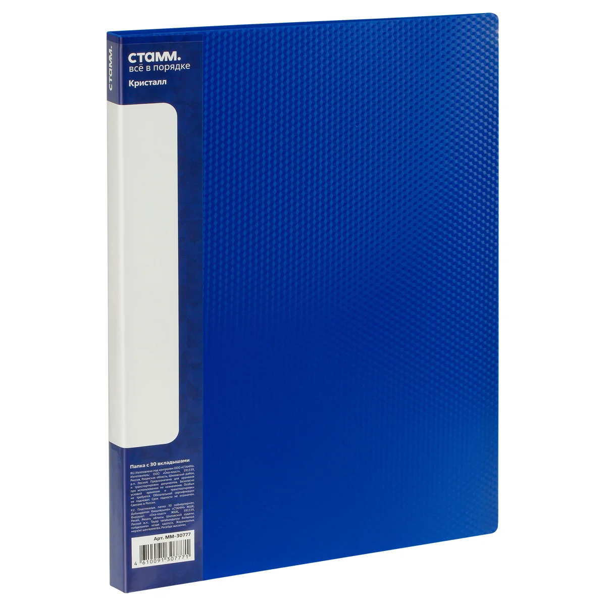 Папка с 30 вкладышами СТАММ серии «Кристалл» – стильный помощник для хранения бумаг формата А4. Изделие выполнено в полупрозрачном синем цвете. Изделие изготовлено из качественного полипропилена толщиной 700 мкм. Внешняя сторона папки дополнена фактурным паттерном «Кристалл», который поможет сохранить внешний вид изделия и избежать загрязнений и повреждений. Размер изделия составляет 310*235 мм. Ширина корешка – 17 мм. Тип скрепления – термосварка. Бумагам, вложенным в папку, не требуется перфорация дыроколом. На корешке папки есть удобный карман. Папка упакована в индивидуальный пакет.