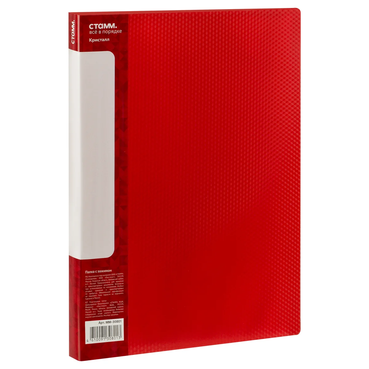 Папка с боковым зажимом «СТАММ» серии «Кристалл» предназначена для сшивания и хранения документов формата А4. Изделие выполнено из полупрозрачного красного пластика. Внешняя сторона папки дополнена фактурным паттерном «Кристалл», сохраняющим внешний вид изделия от загрязнений и повреждений. Папка изготовлена из качественного полипропилена толщиной 700 мкм. Размер папки – 310*235 мм. Тип скрепления – металлический зажим. Ширина корешка – 17 мм позволяет вмещать в папку до 100 листов. На корешке папки имеется карман. Папка упакована в индивидуальный пакет.