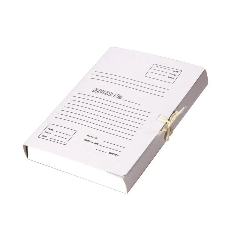 Папка для бумаг формата А4 с 2 завязками, упаковка из 10 штук. Изготовлены из немелованного картона белого цвета (плотность 380 г/кв. м), на лицевой стороне есть поля для подписывания. Вместимость — до 400 листов стандартной плотности. Папка картонная на завязках внутри оснащена тремя клапанами, благодаря которым документы не выпадают.