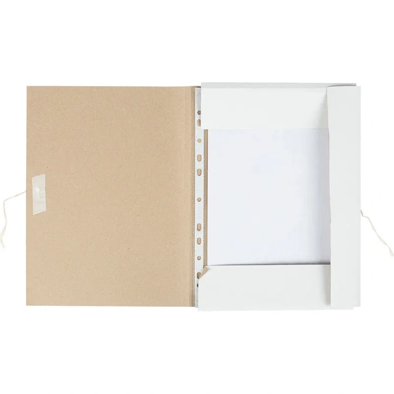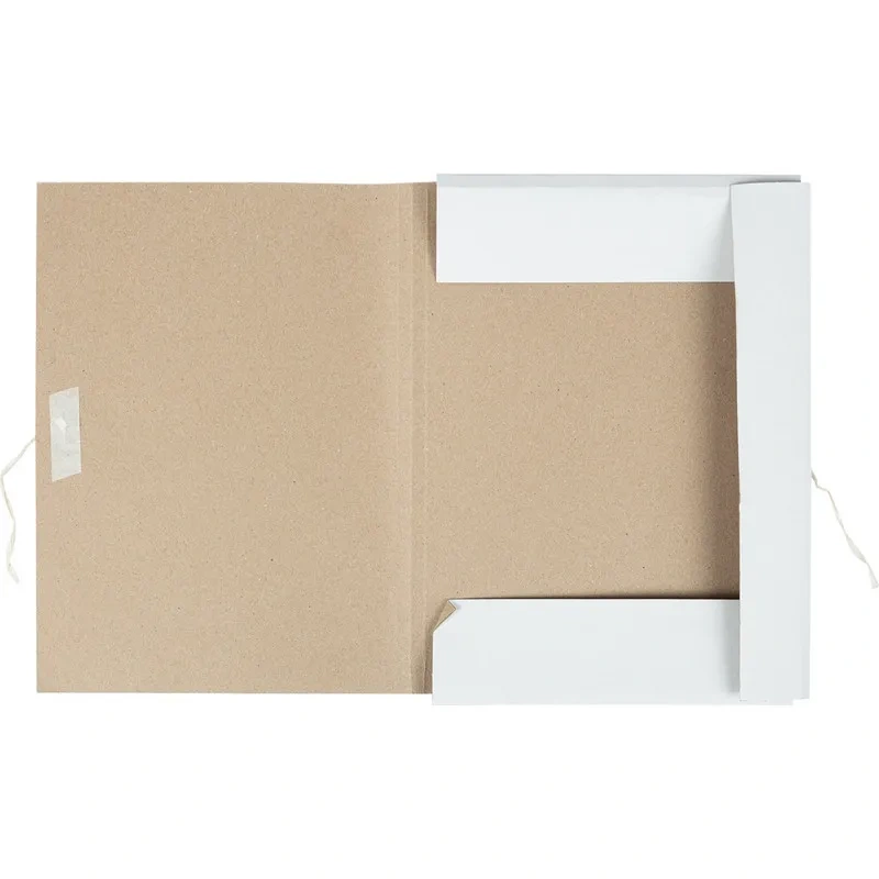 Папка для бумаг формата А4 с завязками изготовлена из немелованного картона белого цвета, на лицевой стороне есть поля для подписывания. Ширина корешка: 20. Три внутренних клапана, благодаря которым документы не выпадают. Папка картонная на завязках вмещает до 200 листов стандартной плотности.