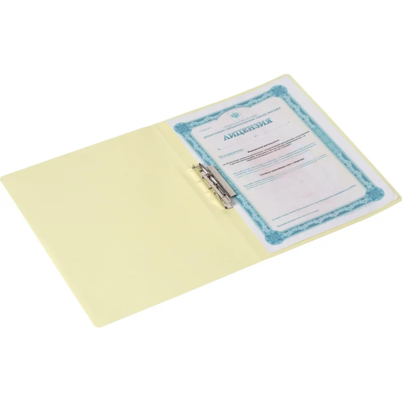 Папка с зажимом Attache Акварель А4, плотн 350мкм, желтая Папки с прижимным механизмом используются для хранения и перемещения документации в офисе. Прижимной механизм отлично удерживает документы и их не нужно прокалывать дыроколом для подшивки в папку. Папка формата А4 изготовлена из полипропилена толщиной 0,35 мм. Ширина корешка - 15 мм. Папка вмещает до 120 листов стандартной плотности.
