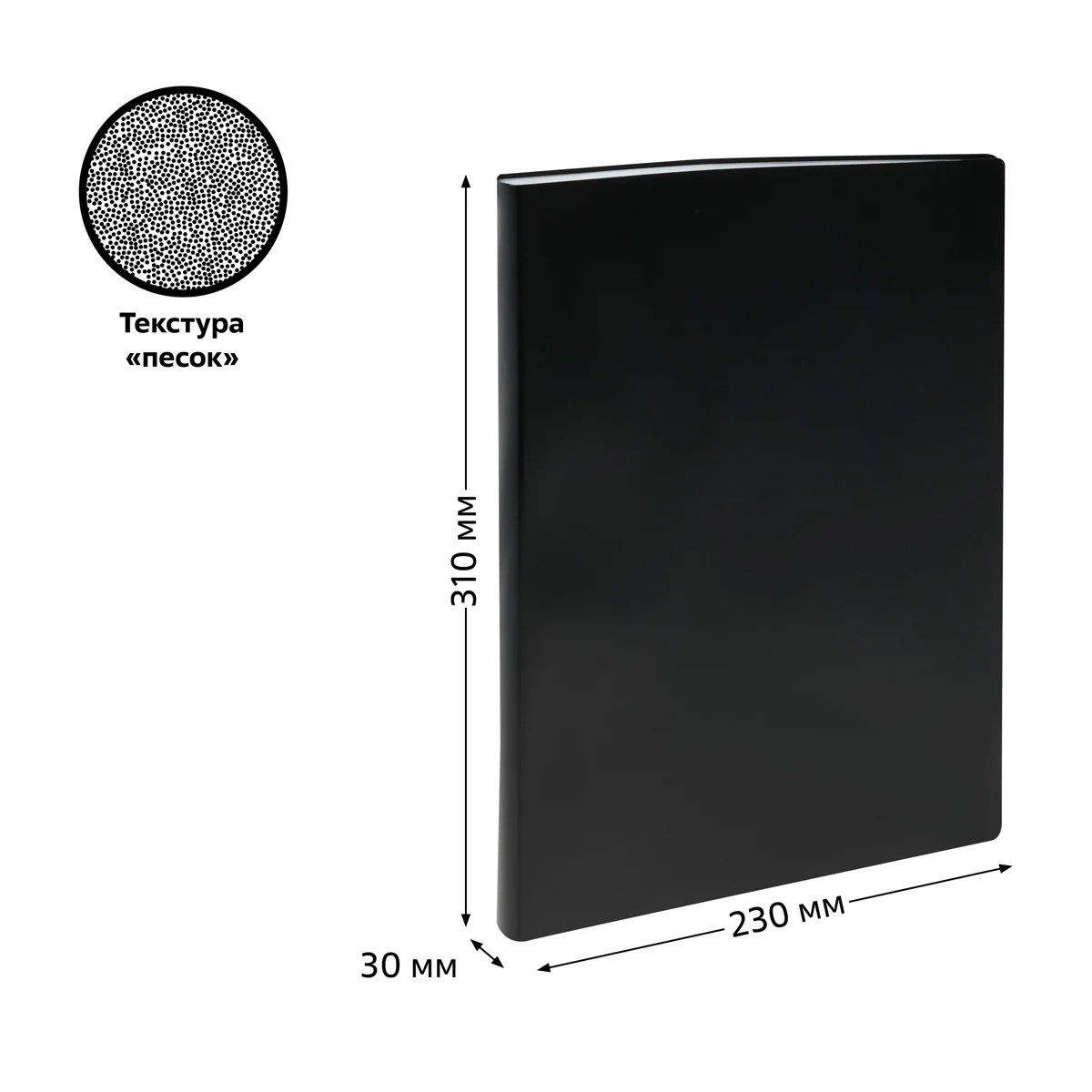 Папка с 100 вкладышами «СТАММ» предназначена для хранения бумаг формата А4. Цвет папки – чёрный. Папка изготовлена из качественного полипропилена плотностью 600 мкм с текстурой «песок». Тип скрепления – термосварка. Размер изделия составляет 310*235 мм. Ширина корешка – 30 мм. Бумагам, вложенным в папку, не требуется перфорация дыроколом. Папка упакована в индивидуальный пакет.