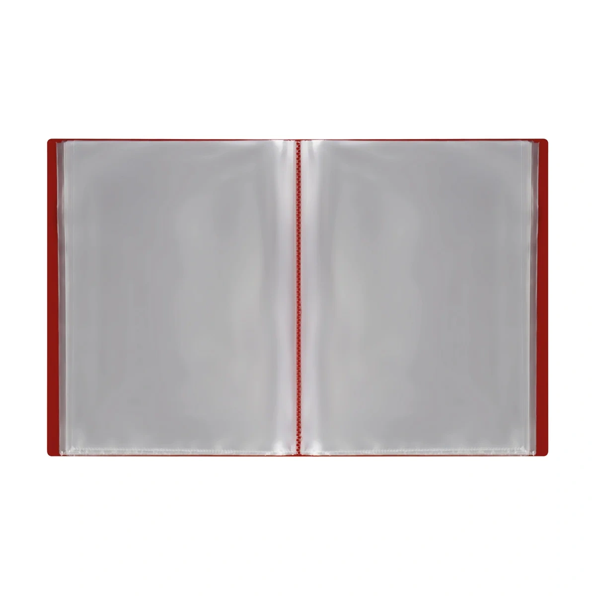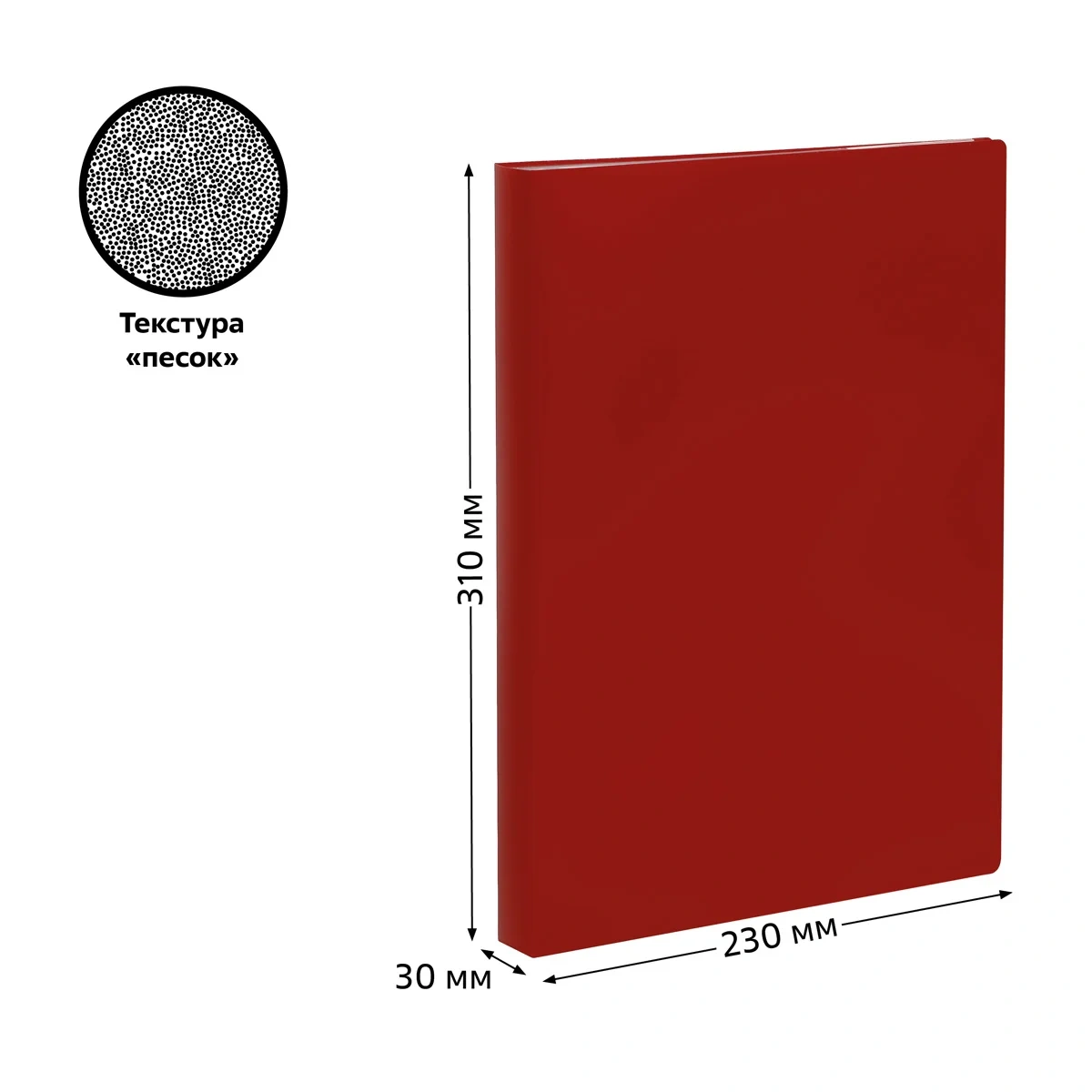 Папка с 100 вкладышами СТАММ предназначена для хранения бумаг формата А4. Модель размером 310*235 мм изготовлена из качественного полипропилена плотностью 600 мкм с текстурой «песок». Ширина корешка – 30 мм. Цвет изделия – красный. Бумагам, вложенным в папку, не требуется перфорация дыроколом. Индивидуальная упаковка в пакет.