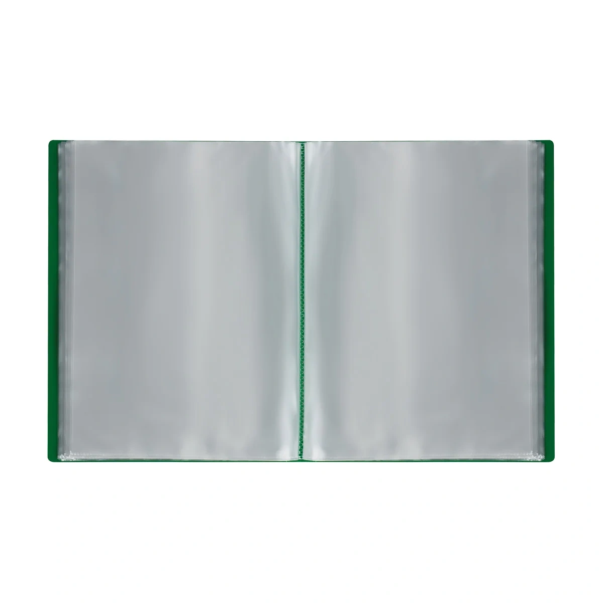Папка с 100 вкладышами СТАММ предназначена для хранения бумаг формата А4. Модель размером 310*235 мм изготовлена из качественного полипропилена плотностью 600 мкм с текстурой «песок». Ширина корешка – 30 мм. Цвет изделия – зелёный. Бумагам, вложенным в папку, не требуется перфорация дыроколом. Индивидуальная упаковка в пакет.