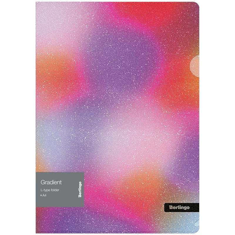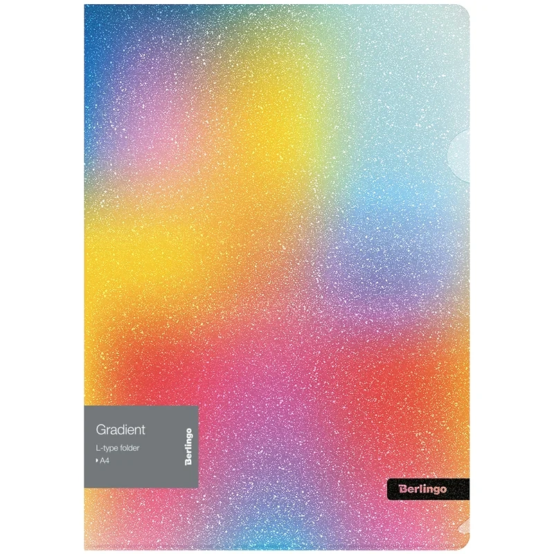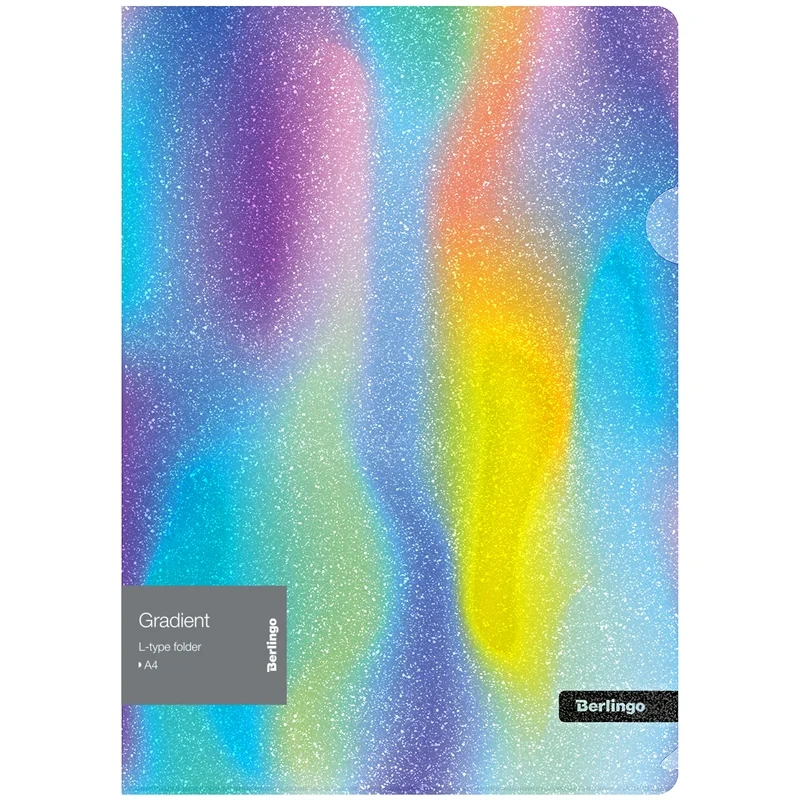 Папка-уголок пластиковая, с эффектом блесток, Berlingo 'Gradient' формата А4. 4 дизайна ассорти в стиле градиент. Эффект блесток достигается благодаря освещению, особенно заметно при холодном LED-освещении. Удобная полукруглая вырубка с лицевой стороны. Быстрый доступ к документам. Изготовлена из высококачественного полипропилена с текстурой поверхности 'апельсиновая корка', на которой не видно отпечатков пальцев и мелких царапин. Предназначена для хранения документов. Толщина 200мкм. Вмещает до 20 листов. Упаковка в прозрачный пакет по форме на 4шт с различными дизайнами. Индивидуальный штрих-код на каждой папке-конверте на съемном стикере с информацией.