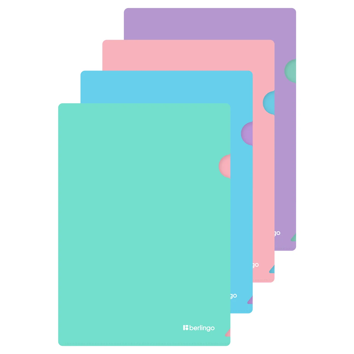 Папка-уголок пластиковая Berlingo 'Haze' формата А4. Уникальная матовая бархатистая софт-тач поверхность. Ассорти из 4 цветов. Яркий привлекательный дизайн кросс-серии Berlingo 'Haze' c использованием двух пастельных цветов. Удобная полукруглая вырубка с лицевой стороны для быстрого доступа к документам. Изготовлена из высококачественного полипропилена. Предназначена для хранения документов. Толщина 200 мкм. Вмещает до 20 листов. Упаковка в прозрачный пакет по форме на 4 шт. Индивидуальный штрих-код на каждой папке-уголке на съемном стикере с информацией.