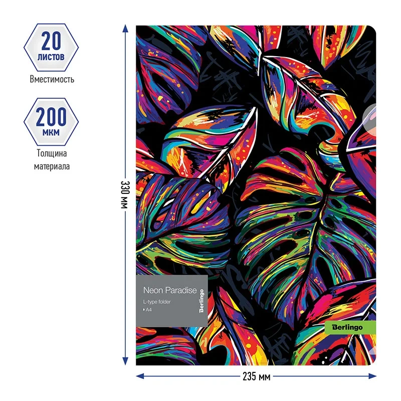 Папка-уголок пластиковая Berlingo 'Neon Paradise' формата А4 с рисунком. Удобная полукруглая вырубка с лицевой стороны. Быстрый доступ к документам. Изготовлена из высококачественного полипропилена с матовой текстурой поверхности 'апельсиновая корка', на которой не видно отпечатков пальцев и мелких царапин. Предназначена для хранения документов. Толщина 200мкм. Вмещает до 20 листов. Упаковка в прозрачный пакет по форме на 12шт. Индивидуальный штрих-код на каждой папке-конверте на съемном стикере с информацией.