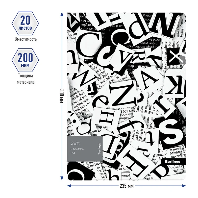 Папка-уголок пластиковая Berlingo 'Swift' формата А4 с рисунком. Удобная полукруглая вырубка с лицевой стороны. Быстрый доступ к документам. Изготовлена из высококачественного полипропилена с матовой текстурой поверхности 'апельсиновая корка', на которой не видно отпечатков пальцев и мелких царапин. Предназначена для хранения документов. Толщина 200мкм. Вмещает до 20 листов. Упаковка в прозрачный пакет по форме на 12шт. Индивидуальный штрих-код на каждой папке-конверте на съемном стикере с информацией.