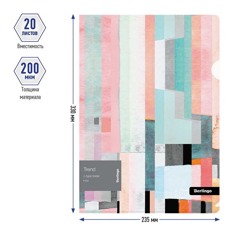 Папка-уголок пластиковая Berlingo 'Trend' формата А4 с рисунком. Удобная полукруглая вырубка с лицевой стороны. Быстрый доступ к документам. Изготовлена из высококачественного полипропилена с матовой текстурой поверхности 'апельсиновая корка', на которой не видно отпечатков пальцев и мелких царапин. Предназначена для хранения документов. Толщина 200мкм. Вмещает до 20 листов. Упаковка в прозрачный пакет по форме на 12шт. Индивидуальный штрих-код на каждой папке-конверте на съемном стикере с информацией.