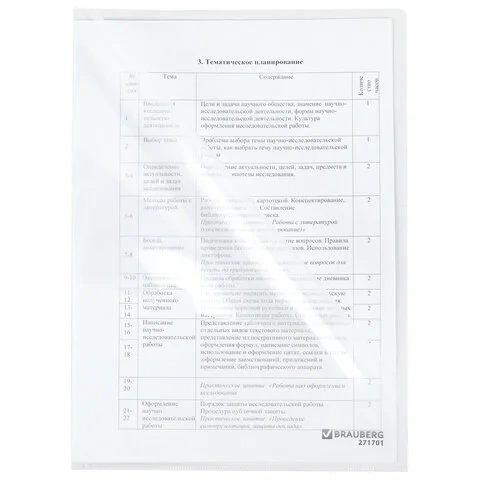 Папка формата А4 выполнена из высококачественного полипропилена плотностью 150 мкм. Она предотвращает смятие, загрязнение или намокание бумаг. Прозрачный материал позволяет увидеть содержимое, не открывая папку. Специальная выемка для перелистывания листов облегчает работу с документами.