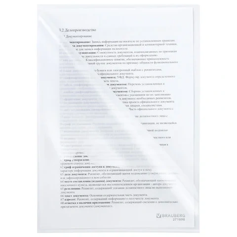 Папка формата А4 выполнена из высококачественного полипропилена плотностью 100 мкм. Она предотвращает смятие, загрязнение или намокание бумаг. Прозрачный материал позволяет увидеть содержимое, не открывая папку. Специальная выемка для перелистывания листов облегчает работу с документами.