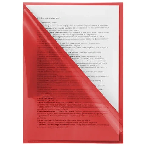 Папка формата А4 выполнена из высококачественного полипропилена плотностью 100 мкм. Она предотвращает смятие, загрязнение или намокание бумаг. Прозрачный материал позволяет определить содержимое, не открывая папку. Специальная выемка для перелистывания листов облегчает работу с документами. Данная папка заметно выделяется среди других благодаря яркому красному цвету.