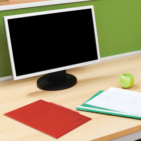 Папка формата А4 выполнена из высококачественного полипропилена плотностью 150 мкм. Она предотвращает смятие, загрязнение или намокание бумаг. Непрозрачный материал способен скрыть содержимое от посторонних глаз. Имеет 3 отделения, разделенных ярлычками. Данная папка заметно выделяется среди других благодаря яркому красному цвету.