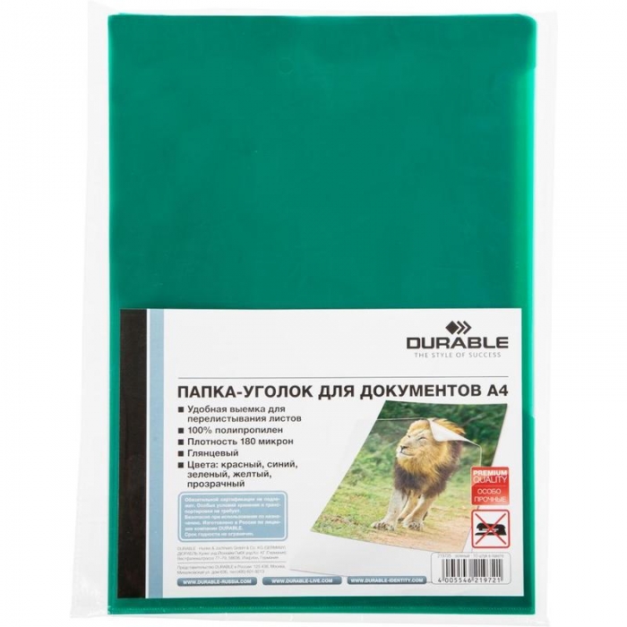 Папка-уголок Durable зеленая, А4, 180мкм, 10шт/уп, 219705