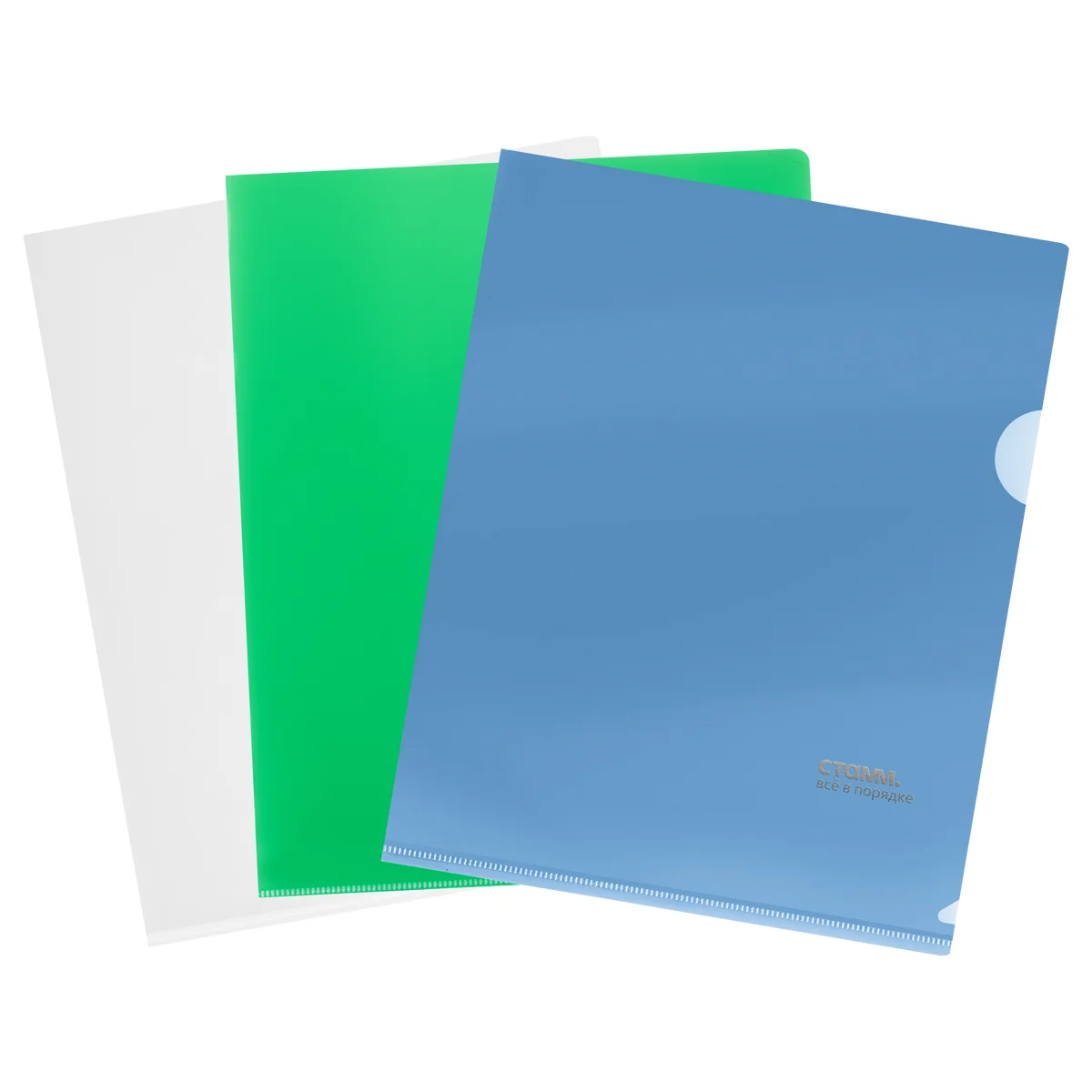 Папка-уголок «СТАММ» формата А5 предназначена для хранения и транспортировки документов. Вмещает до 50 листов. Папка изготовлена из качественного полипропилена толщиной 180 мкм. Изделие защищает бумаги от повреждений и загрязнений. Боковой вырез обеспечивает удобство использования. Размер папки – 175*222 мм. В упаковке представлено ассорти из трёх цветов: бесцветного, зелёного и синего.