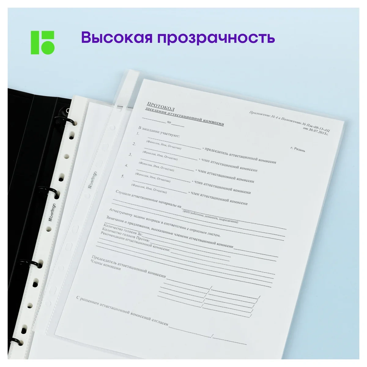 Матовые прозрачные файлы-вкладыши Berlingo Squares формата А4 размера 305*235 мм предназначены для хранения неперфорированных документов А4 в любых папках и защиты листов от внешних воздействий. Вертикальная ориентация, толщина пленки 30 мкм, вместимость файла от 50 до 100 листов бумаги, в зависимости от плотности. В упаковке 100 штук. Уникальная технология производства вкладышей, при которой используется до 40% больше материала, благодаря чему достигается максимальная прочность каждого вкладыша. Масса каждого вкладыша 3,6г. Уникальная рельефная фактура поверхности вкладышей позволяет легко помещать и извлекать документы, препятствует «прилипанию» вкладышей. Серебристый логотип бренда на боковой ленте.