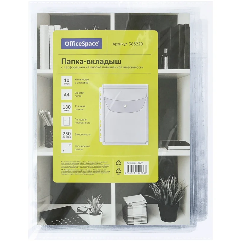 Расширяющиеся прозрачные файлы-вкладыши на кнопке OfficeSpace формата А4 размером 310*238 мм предназначены для хранения и транспортировки документов, защищают документы от внешних воздействий. Вертикальная ориентация, толщина пленки 180 мкм. В упаковке 10 штук.