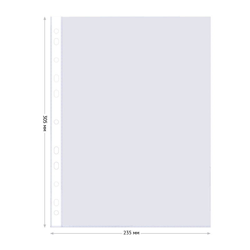 Прозрачная папка-вкладыш с универсальной перфорацией. Для хранения неперфорированных документов А4 в любых папках. Толщина пластика 25 мкм, вместимость -до 60 листов бумаги 80г/м2. В упаковке 100шт. Антибликовая фактура 'апельсиновая корка' позволяет копировать документы, не вынимая их из папки.