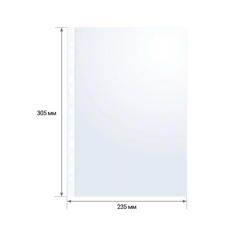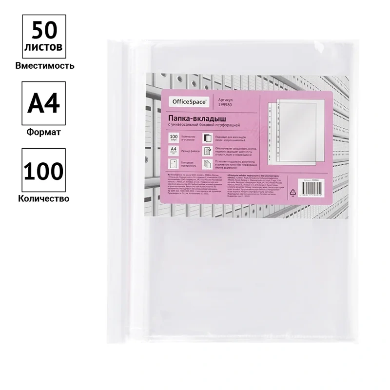 Бюджетные глянцевые прозрачные файлы-вкладыши OfficeSpace формата А4 размера 305*232 мм предназначены для хранения неперфорированных документов А4 в любых папках с кольцевым механизмом и скоросшивателем, и позволяют систематизировать и обеспечить сохранность документов. Вертикальная ориентация, вместимость файла до 50 листов бумаги. В упаковке 100 штук. Глянцевая поверхность и яркий информационный вкладыш в каждой групповой упаковке.