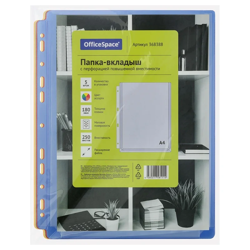 Папка-вкладыш с перфорацией OfficeSpace А4, ПВХ, 180мкм, расширяющаяся до 250л., цветная, ассорти, 5