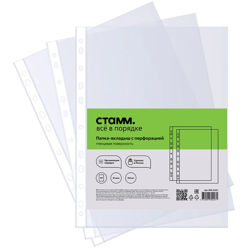 Файл-вкладыш А4 Стамм А4, 35мкм, глянцевая, 100шт
