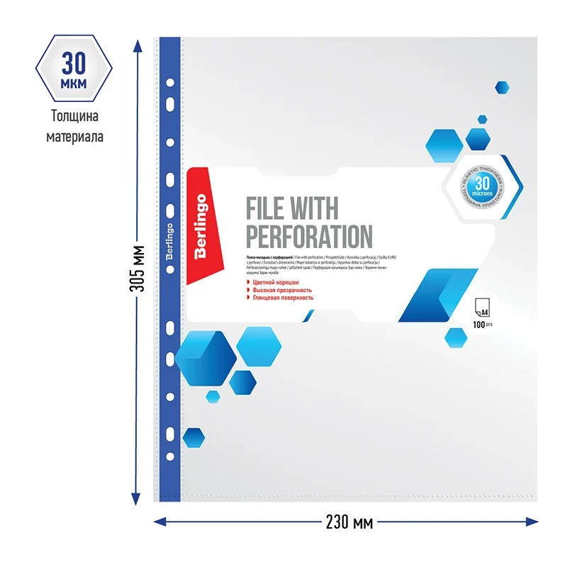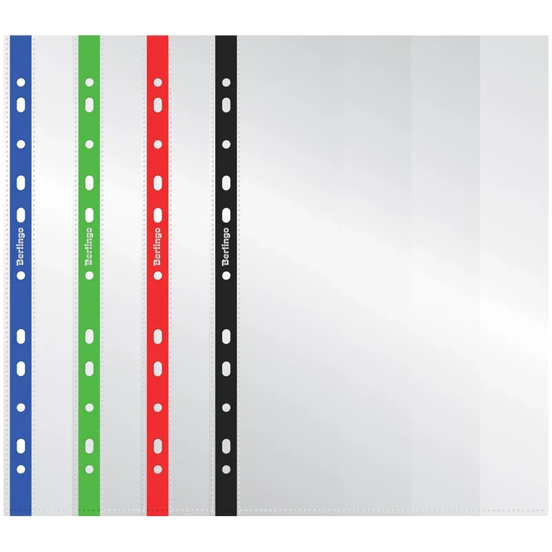 Папка - вкладыш с универсальной перфорацией для хранения неперфорированных документов А4. Толщина пластика 30 мкм, глянцевая поверхность, высокая прозрачность. Цветной корешок ассорти (синий, черный, красный, зеленый) для сортировки документов. Упаковка в пакет по 100шт.