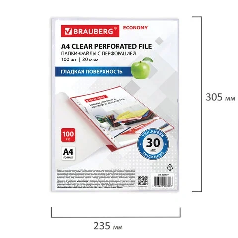 Файл-вкладыш А4 Brauberg Эконом прозрачный, 30 мкм, гладкие, 100шт/уп 229659