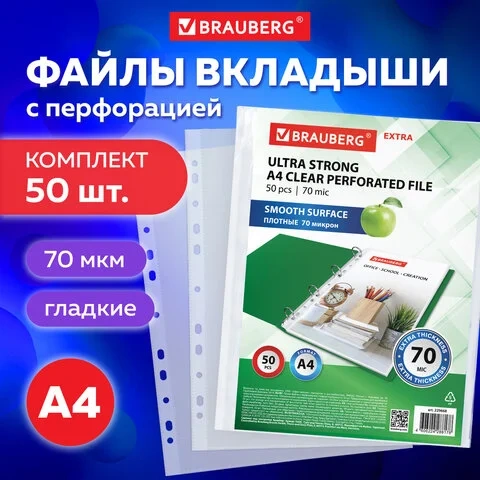 Файл-вкладыш А4 Brauberg 'EXTRA 700' прозрачный, 70 мкм, 50шт/уп, гладкие