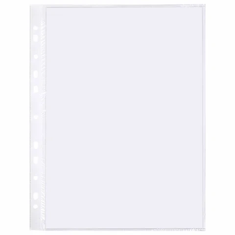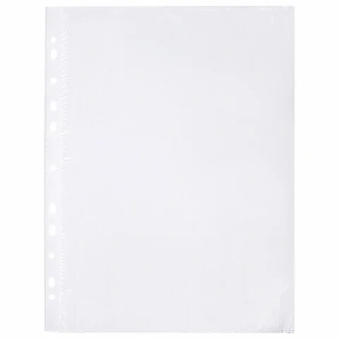 Перфопапки формата А4 с вертикальным размещением содержат универсальную перфорацию, а также имеют матовую поверхность и прочные швы. Файлы являются незаменимым атрибутом в офисе, позволяют систематизировать документы и обеспечивают их сохранность на долгое время. Изготовлены из пленки толщиной 40 мкм. В комплект входит 100 перфопапок.
