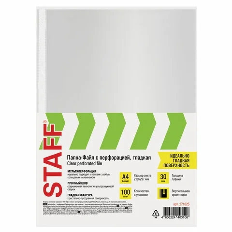 Файлы являются незаменимым атрибутом в офисе, позволяют систематизировать документы и обеспечивают их сохранность на долгое время. Изготовлены из пленки толщиной 30 мкм. В комплект входят 100 перфопапок.