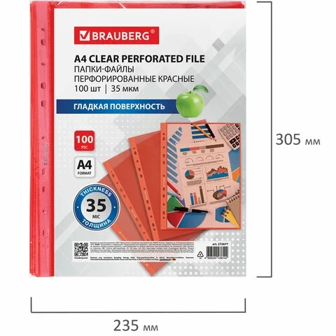 Папки-файлы перфорированные КРАСНЫЕ А4 BRAUBERG, комплект 100 шт., гладкие, 35 мкм, 272677