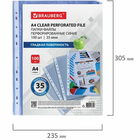 Файлы изготовлены из прочной пленки толщиной 35 мкм. В упаковке 100 перфопапок.
