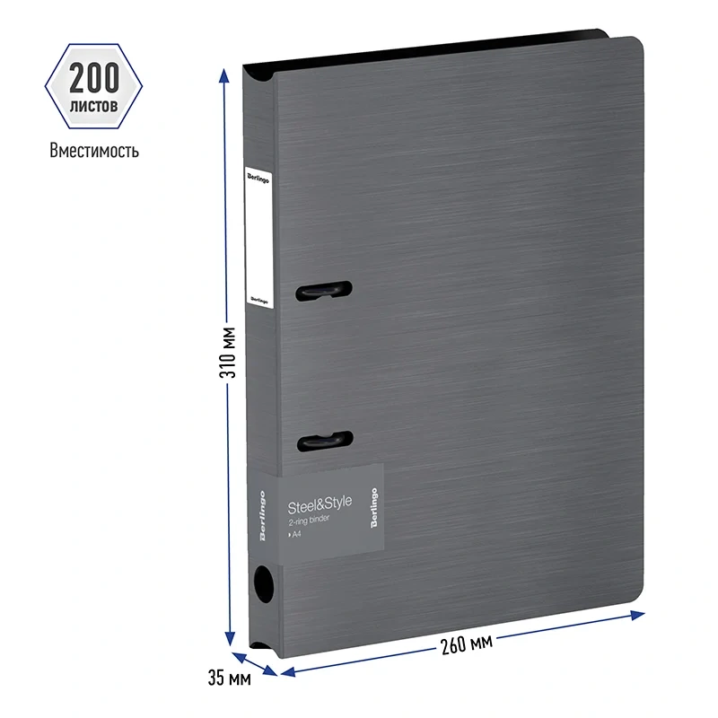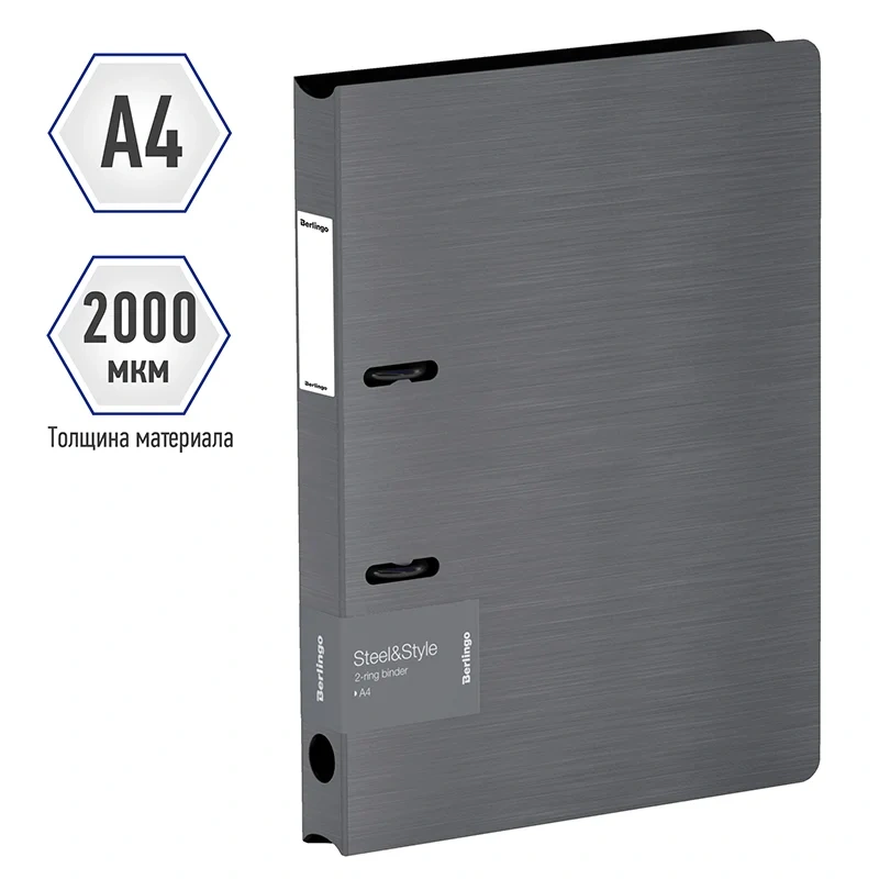 Папка на 2 кольцах Berlingo 'Steel&Style', 35мм, 2000мкм, D-кольца, пластик (полифом), серебристый м