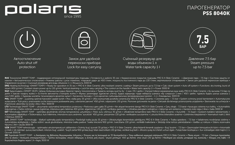 Технология Smart Temp - поддержание оптимальной температуры подошвы. Можно гладить любые ткани без риска испортить материал. Время подготовки к работе: 35 секунд. Электронное управление на ручке. Мощность 3000Вт. Мощность постоянного пара 130г/мин. Мощность парового удара 450г/мин. Съемный резервуар для воды 1л. Давление 7,5 бар. Электронное управление на ручке. Автоотключение. Удобный замок для переноски. Удобная фиксация парового шланга и шнура на базе. Гарантия 3 года. Оснащен системой постоянной подачи пара 130г/мин и паровым ударом с интенсивностью 450г/мин, что обеспечивает тщательное разглаживание стойких складок на разных тканях. Съемный резервуар вмещает до 1л воды. Технология Smart Temp поддерживает температуру и снижает риск повреждения ткани в процессе глажки. Подошва с керамическим покрытием Pro 5 Ceramic обеспечивает легкое перемещение утюга. Она устойчива к царапинам и отличается простотой в очистке. На ручке парогенератора Polaris PSS 8040K расположена электронная панель управления с индикаторами. Замок на базе повышает комфорт переноски и хранения прибора.