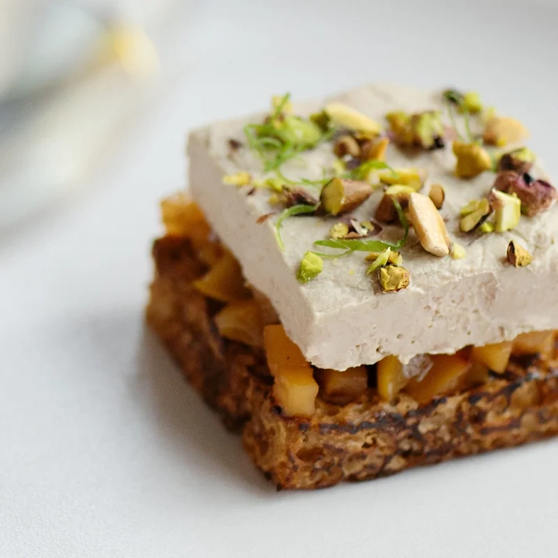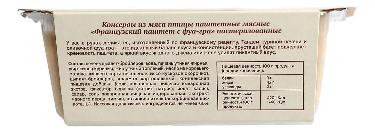Изготовлен по французскому рецепту. Тандем куриной печени и 15% сливочной фуа-гра - это идеальный баланс вкуса и консистенции. Хрустящий багет отлично подчеркнет кремовость паштета, а яркий вкус ягодного джема или желе сбалансирует жирность, присущую паштету с фуа-гра в составе.