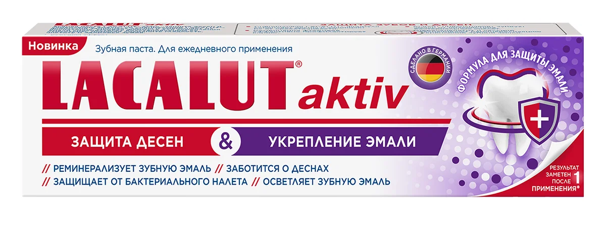 Защищает десны и уменьшает их воспаление. Особая формула для укрепления эмали способствует восстановлению ее структуры, помогая сохранить гладкость, чистоту и здоровье зубов. Специальная Lacalut - формула укрепляет десны и защищает их от кровоточивости. Комбинация фторидов эффективно профилактирует кариес. Ксилит предохраняет зубную эмаль от воздействия бактериальных кислот. Гидроксиапатит и кальций обеспечивают реминерализацию и укрепление зубной эмали.