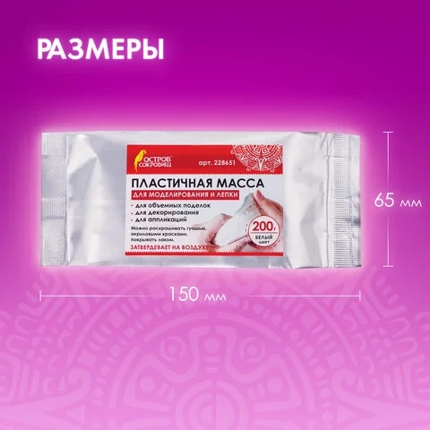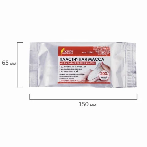 Масса для лепки ОСТРОВ СОКРОВИЩ белого цвета фасовкой 200 грамм упакована в герметичную фольгированную упаковку, что позволяет хранить товар в течение длительного времени. Масса очень податлива: моделируется руками, пластична, легко лепится, раскатывается, режется, принимает любую форму. При необходимости можно использовать инструменты. Чтобы избежать появление трещин на изделии после застывания, необходимо работать с массой влажными руками. Затвердевает на воздухе, после высыхания становится очень прочной, не усаживается.