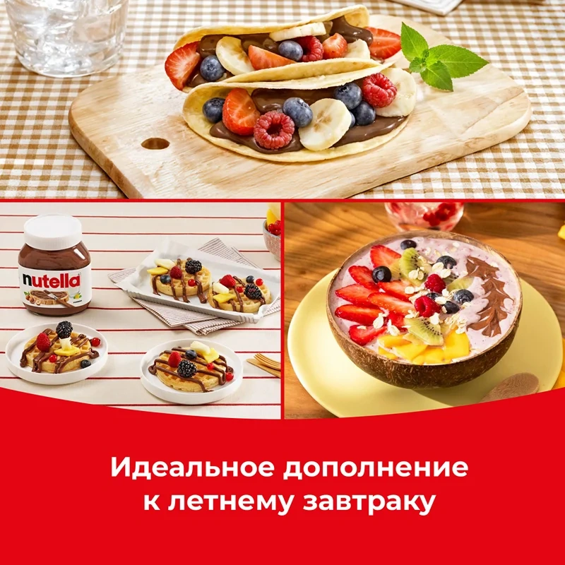 Шоколадная паста «Nutella» - это десерт с мягким ореховым вкусом и густой консистенцией. В состав входит ядра фундука и ароматные какао-бобы, которые насыщают и питают организм, обеспечивая энергию на целый день. Паста также подходит для использования в кулинарии для украшения и оформления выпечки.
