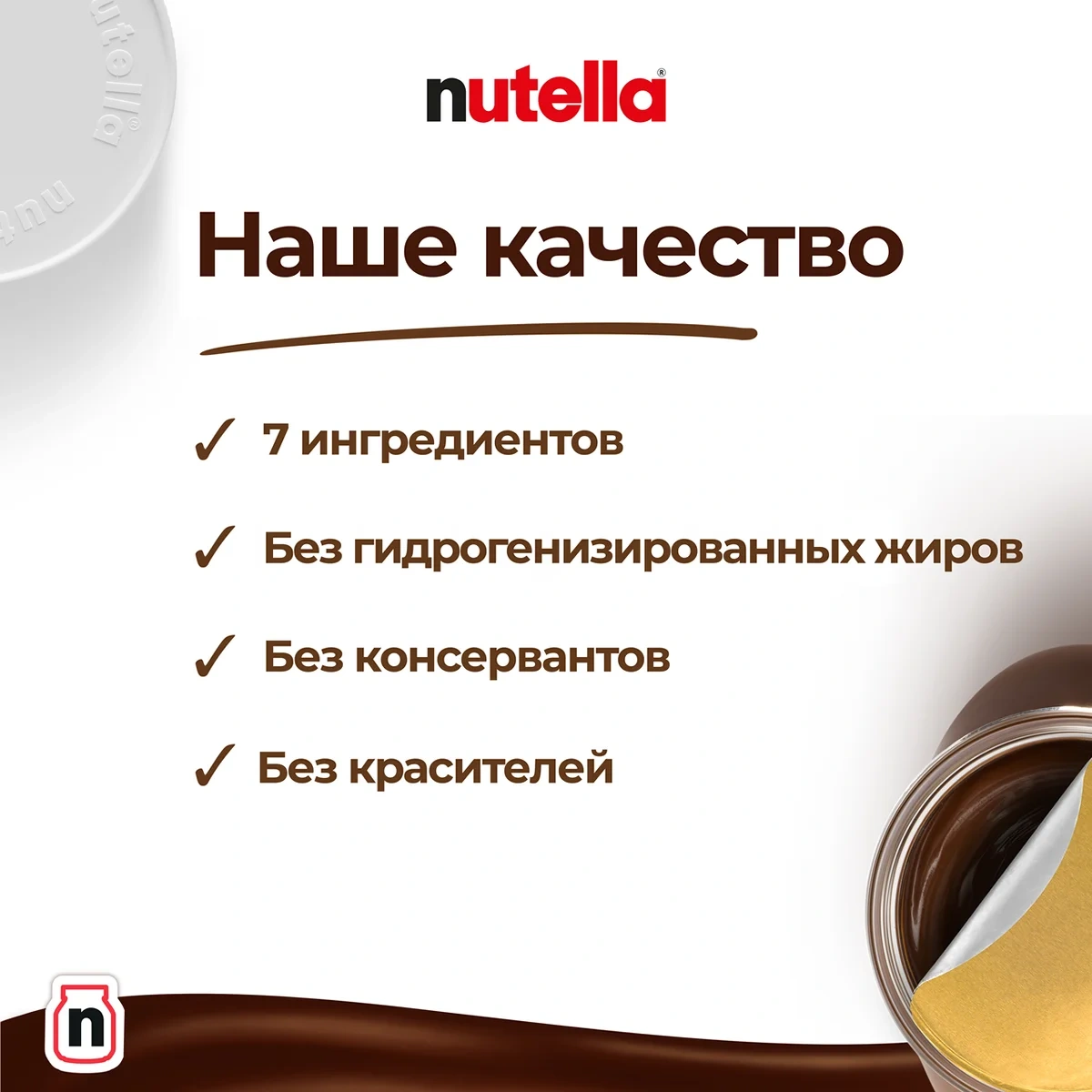 Nutella обладает неповторимым вкусом лесных орехов и какао, а ее нежная кремовая текстура делает вкус еще более интенсивным. Секрет уникального вкуса заключается в особом рецепте, отборных ингредиентах и тщательном приготовлении. При производстве Nutella не используются консерванты и красители.