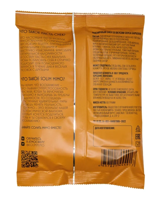 Паста-снек Solim Mimo Фузилли барбекю, 60г